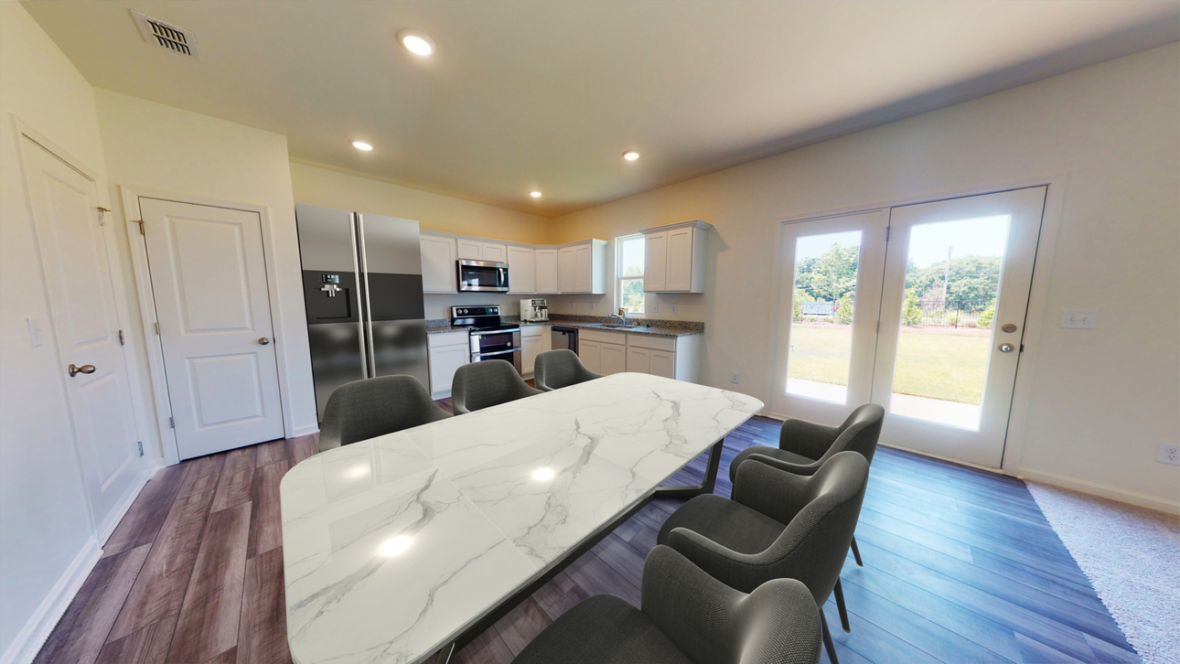 From the front porch, you enter into the foyer, where the staircase immediately greets you to the second floor, a coat closet, and a conveniently located powder bath. As you continue, the home opens into the family room, dining area, and kitchen. A patio is located just off the dining area, and the kitchen offers access to the two-car garage. Upstairs, you’ll find three secondary bedrooms—one with its own walk-in closet—that all share a full bath. The laundry room is located at the top of the stairs for easy access. The primary bedroom completes the second floor, featuring a spacious walk-in closet and a private primary bath.